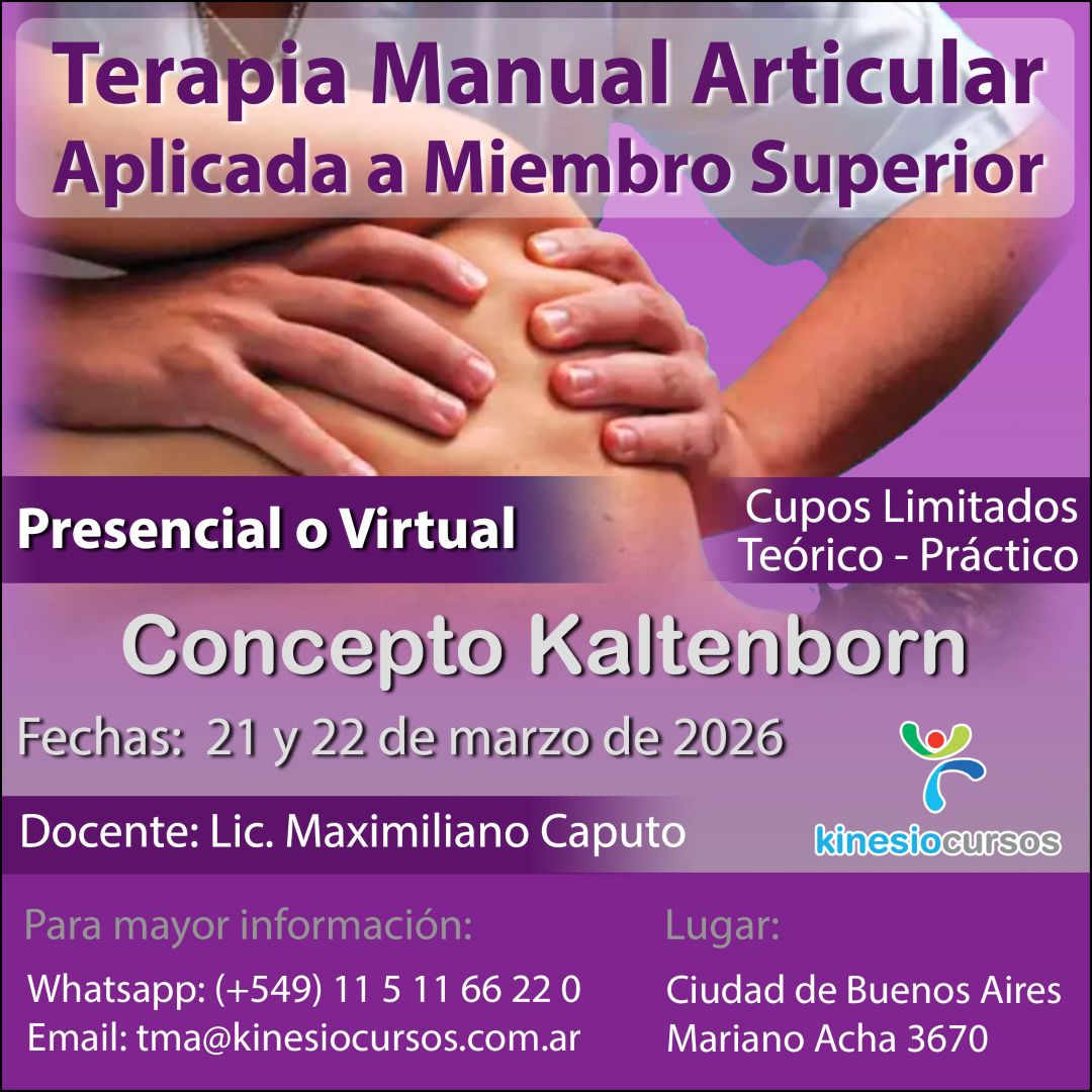 Introducción: Artrocinemática y osteocinemática Biomecánica articular normal y alterada (según Kaltenborn).Concepto de “rodar-deslizar”.Relevancia práctica. Posicionamiento articularPosición cero, posición de bloqueo, posición de reposo, posición de reposo actual.Definición; utilidad diagnóstica y terapéutica.Slack articular:Definición; utilidad en el diagnóstico y tratamiento.1. Diagnóstico2. Test directos e indirectos.3. Regla cóncava convexa.Cuantificación: grados de movimiento4. Definición.5. Utilidad diagnóstica y terapéutica.Objetivos de tratamiento6. Movilización para lograr analgesia.7. Movilización para prevenir hipomovilidades.8. Movilización para tratar hipomovilidades.9. Comparación con la movilización angular “clásica”.Movimientos acoplados y no acoplados10. Definición.11. Relevancia clínica y terapéutica.12. Indicaciones, precauciones y contraindicaciones de la técnicaRevisión de publicaciones científicas13. Implementación de la técnica14. Evaluación del paciente.15. Aplicación clínica de las técnicas.16. Proceso de razonamiento clínico y confección de programa de tratamiento.17. Casos Problema.